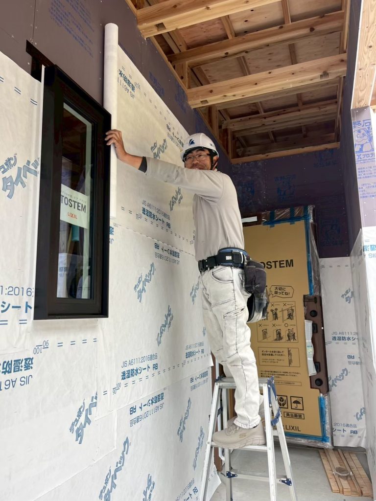 終わり次第、サイディング屋さんが透湿防水シートを貼っていきます。