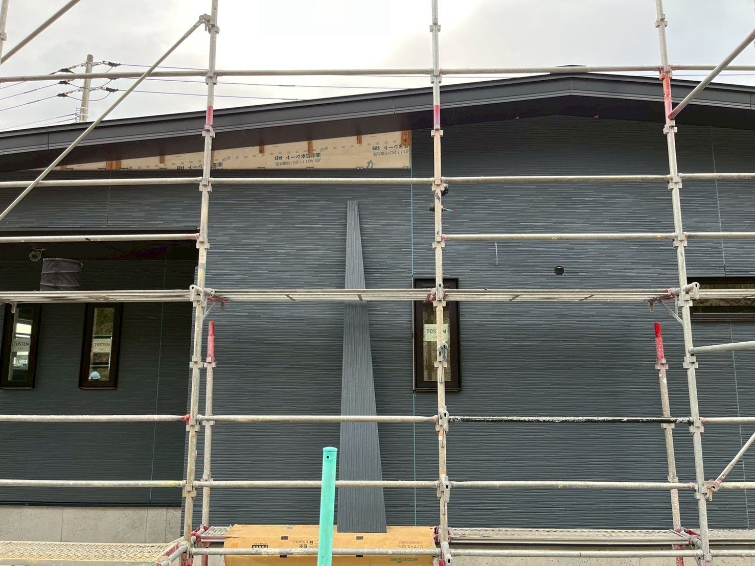 外部の足場を利用しての作業は、換気フードや外部の照明、エアコンなどの電気・換気関係、樋の設置に軒天の設置、太陽光が必要なら撤去までのタイミングに作業をする必要があります。