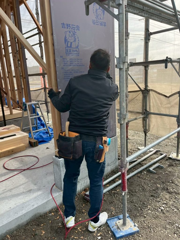 サイディング工事を全部まとめたかったのですが、その前に棟梁が耐力面材を外壁面に貼っていきます。通常、筋交いと言われる木と木をたすき掛けをしたような仕様もあります。