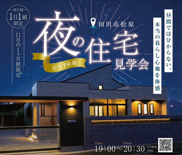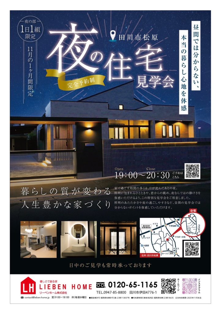 夜のモデルハウス見学会開催 liebenhome2025年10月30日2025年10月30日イベント見学会、新着情報 投稿ナビゲーション 前 【1ヶ月限定】夜のモデルハウス見学会 2025/11/1(土)~2025/11/30(日)19:00~20:30 1日1組限定 完全予約制 「昼間はなにかと忙しい」「夜の雰囲気もみてみたい」「仕事終わりにゆっくりみたい」 そんな方へ向けた見学会になっております。昼間では体感出来ない、夜ならではの住宅をご体感ください。 夜だけでなく、日中もご見学いただけますのでお気軽にご連絡ください。 0120-65-1165 ↓気になる方はこちらもご覧ください↓ モデルハウス見学会(夜の部)
