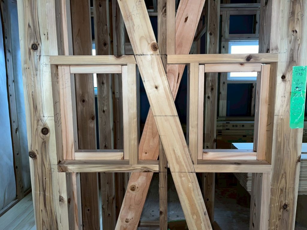 間柱や筋交いなどを始め、窓台や天井、ドア枠などを組んでいきます。