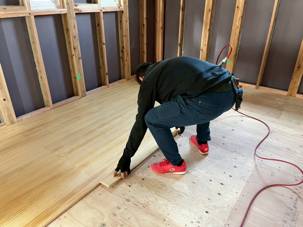 そのまま床材も貼っていきます。ウッドワンさんの無垢材ピノアースを標準仕様としています。