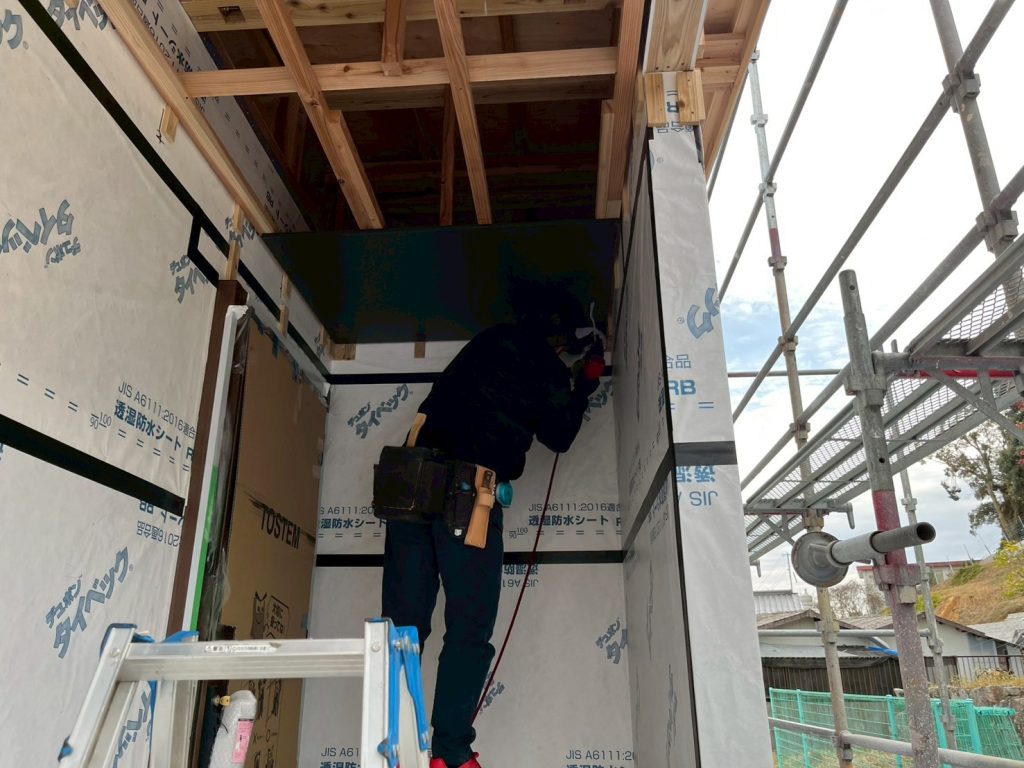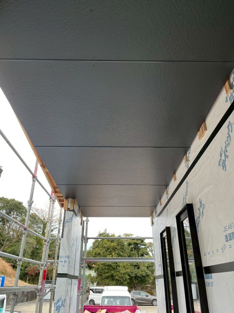軒天を貼っていきます。お家の外観色に合わせて明るめ、暗めと色の変更も出来ます。