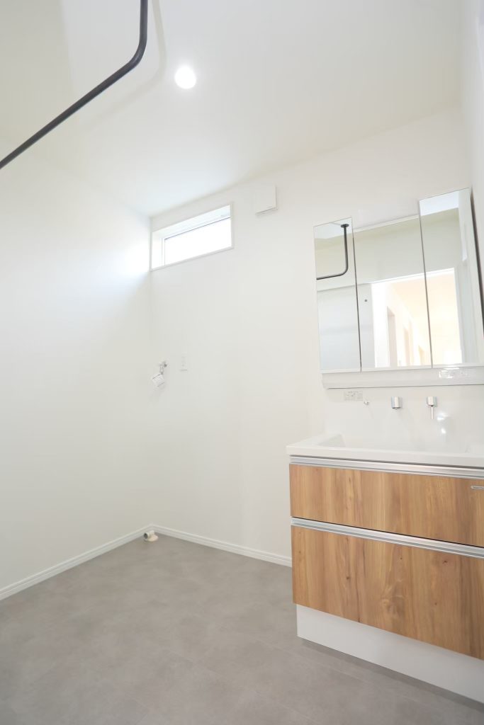 洗面台と洗濯機、アイアンバーとランドリースペースの役割を果たす。