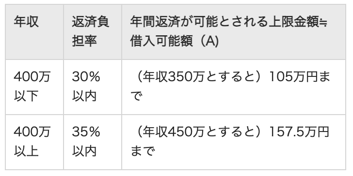 収入によって借りられる金額は決まっており、各金融機関が独自に設定している「返済負担率」からおおよそ算出されます。返済負担率とは、その人の年収から年間どのくらいの金額であれば返済できるかを数値化したものであり、年収が高いほど返済能力があると見なされ、返済負担率は上がります。